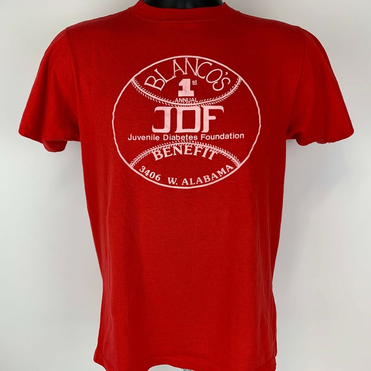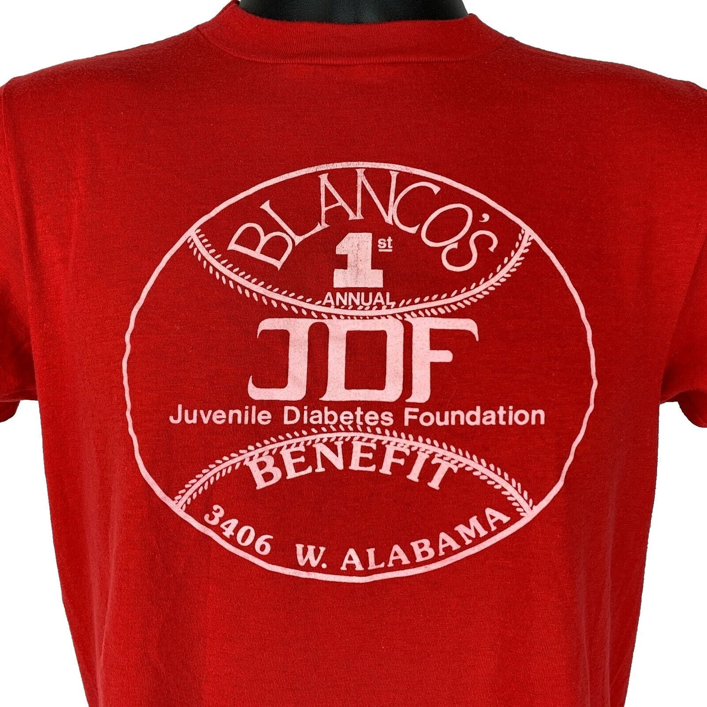 Vintage 1980s Blancos JDF Juvenile Diabetes Foundation Benefit Baseball T Shirt Softball Houston Texas Red Single Stitch Made In USA Graphic Tee