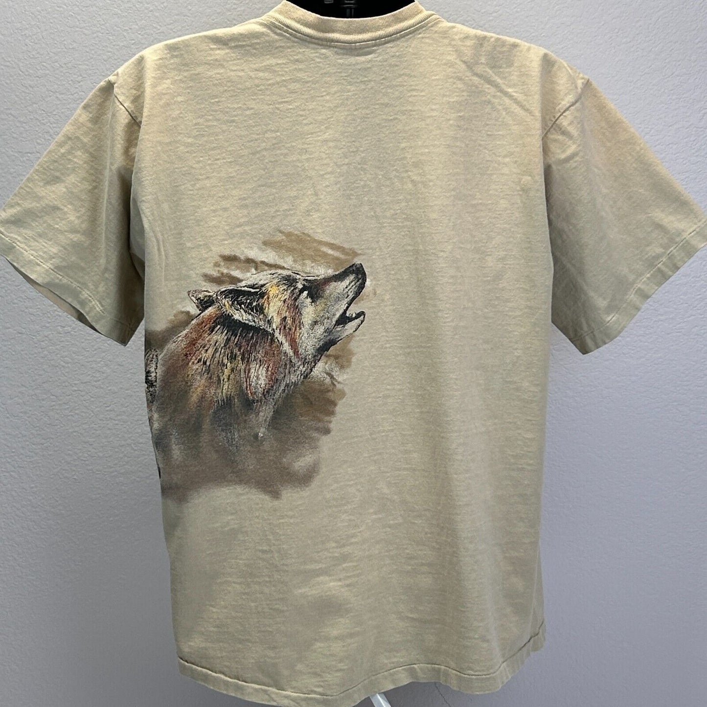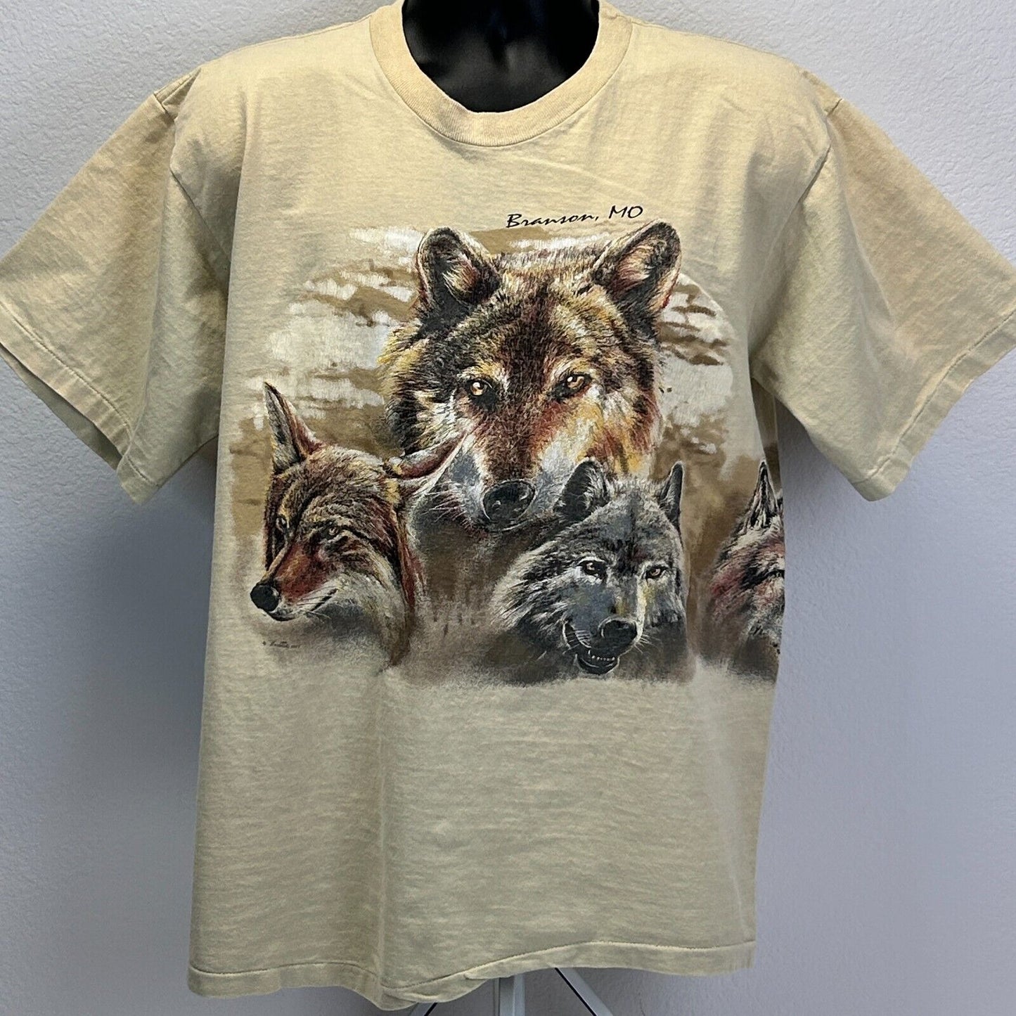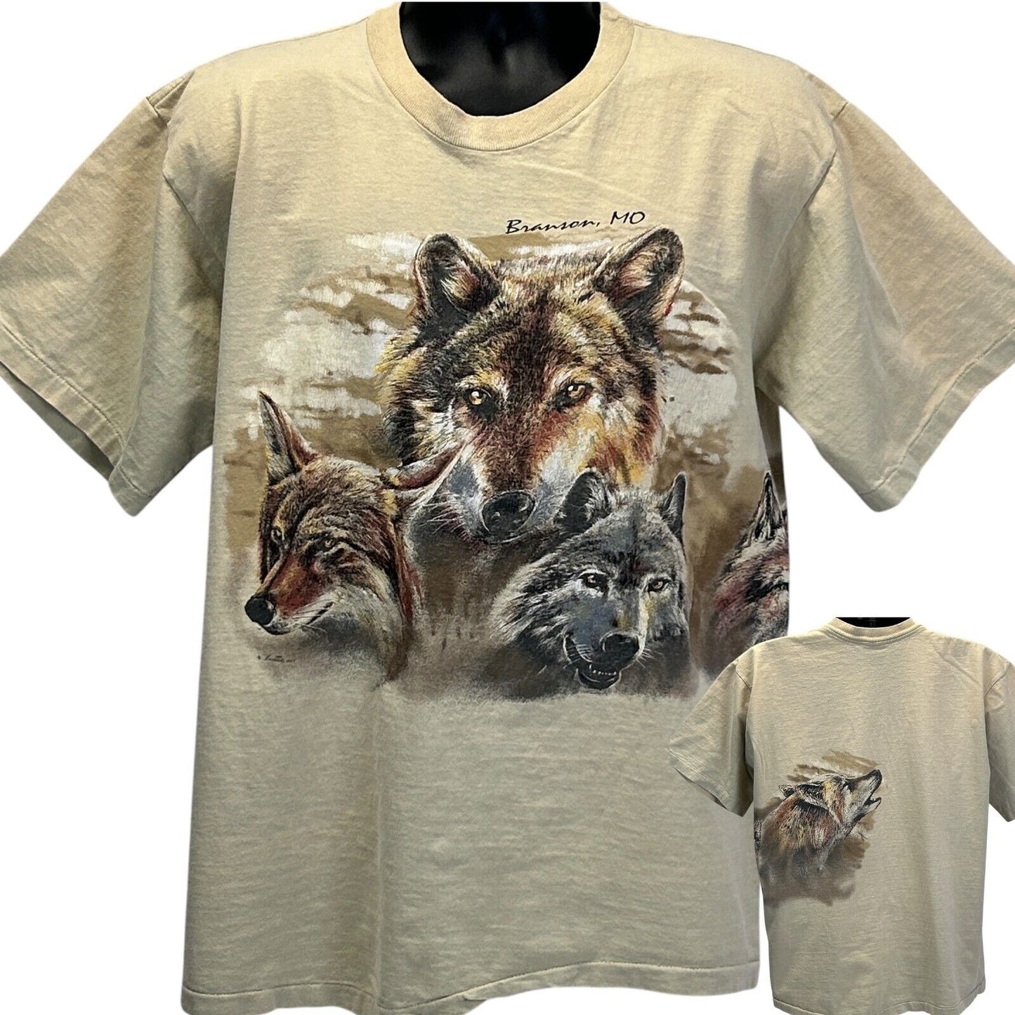 Vintage Branson Missouri Wolves T Shirt Mens X-Large Wolf Nature 90s Beige Hazelwoods Single Stitch Made In USA Graphic Tee