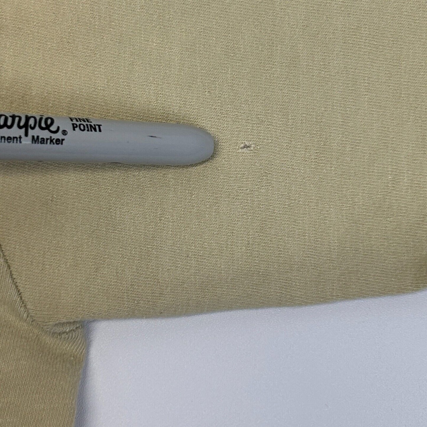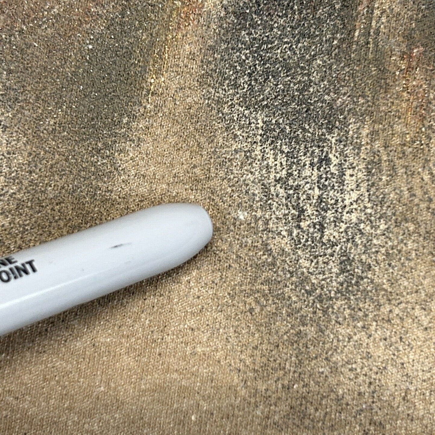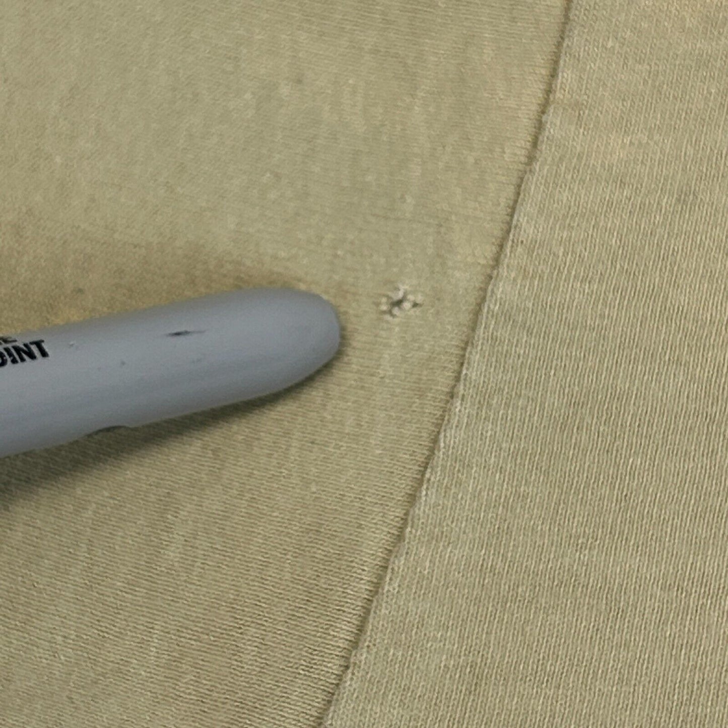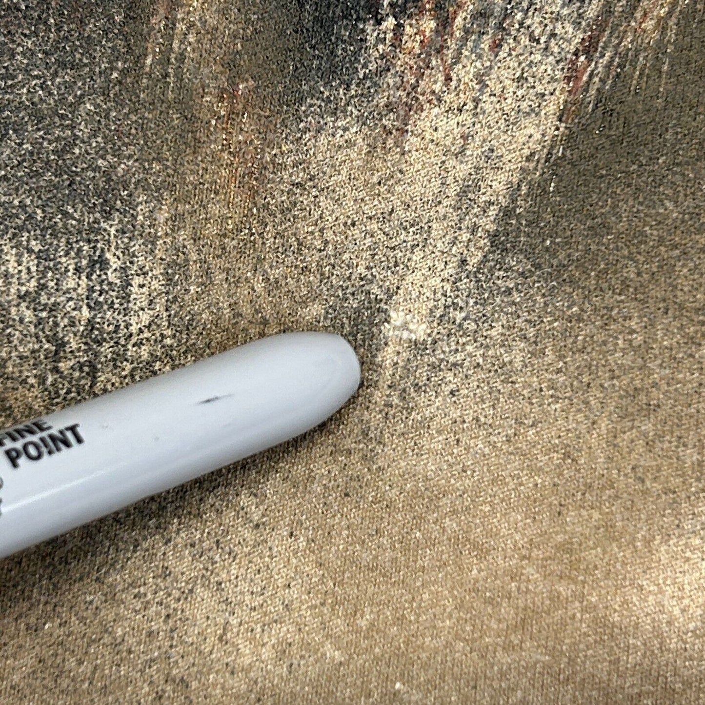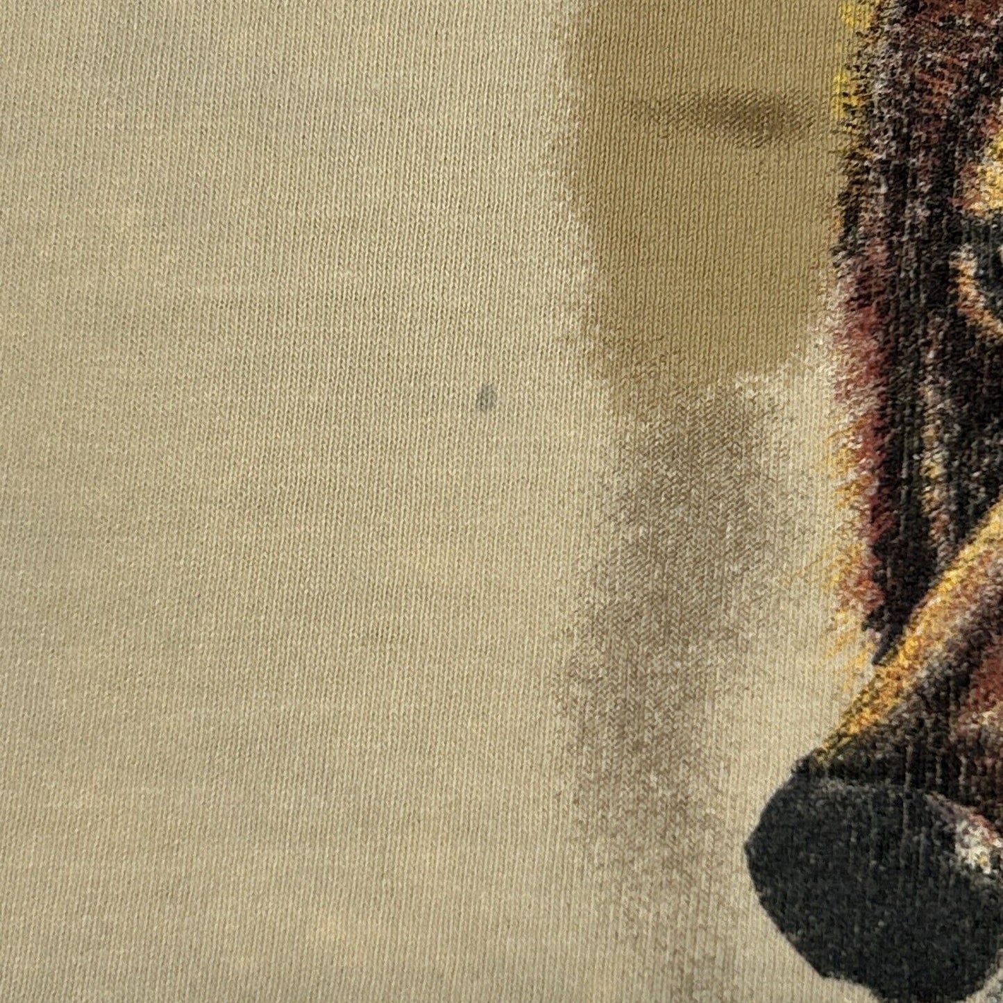 Has image cracking, spots and discoloration, a hole at the bottom, and a few tiny pinholes have been patched from the inside. The holes should not spread further and skin will not show through. No other flaws noticed. See photos.