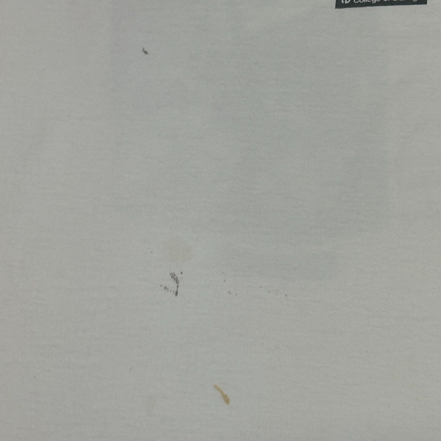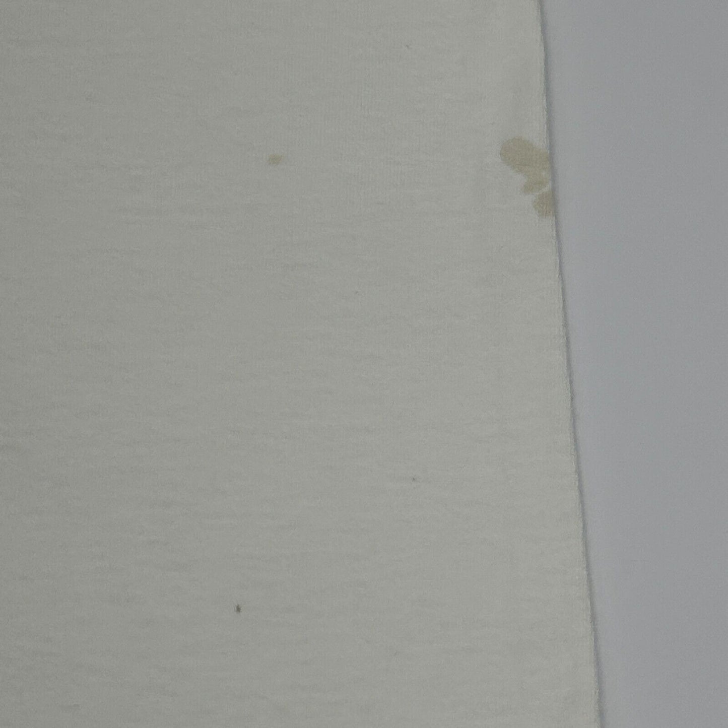 Has a small hole on the back collar, image fading, and paint spots. No other flaws noticed. See photos.