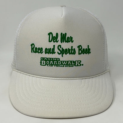 Vintage Del Mar Race and Sportsbook Trucker Hat Baseball Cap Boardwalk Hotel and Casino Las Vegas Gambling Gambler 90s Nissin Five Panel A-Frame Mesh Snapback White