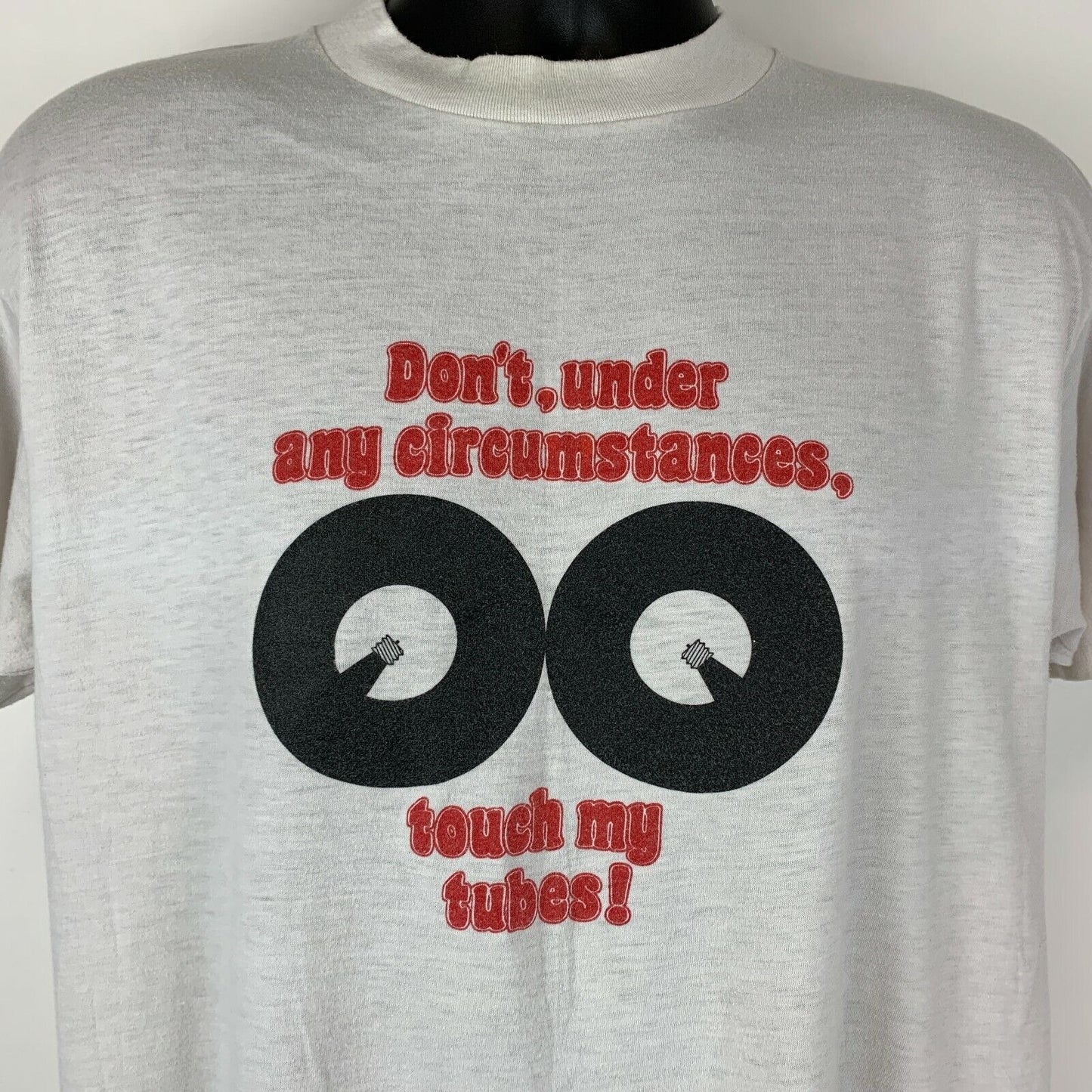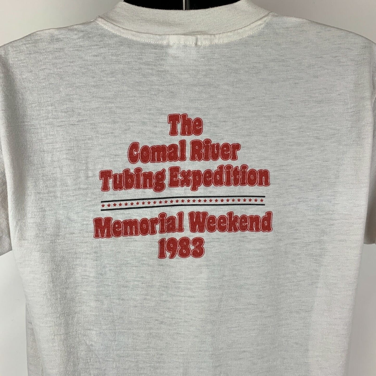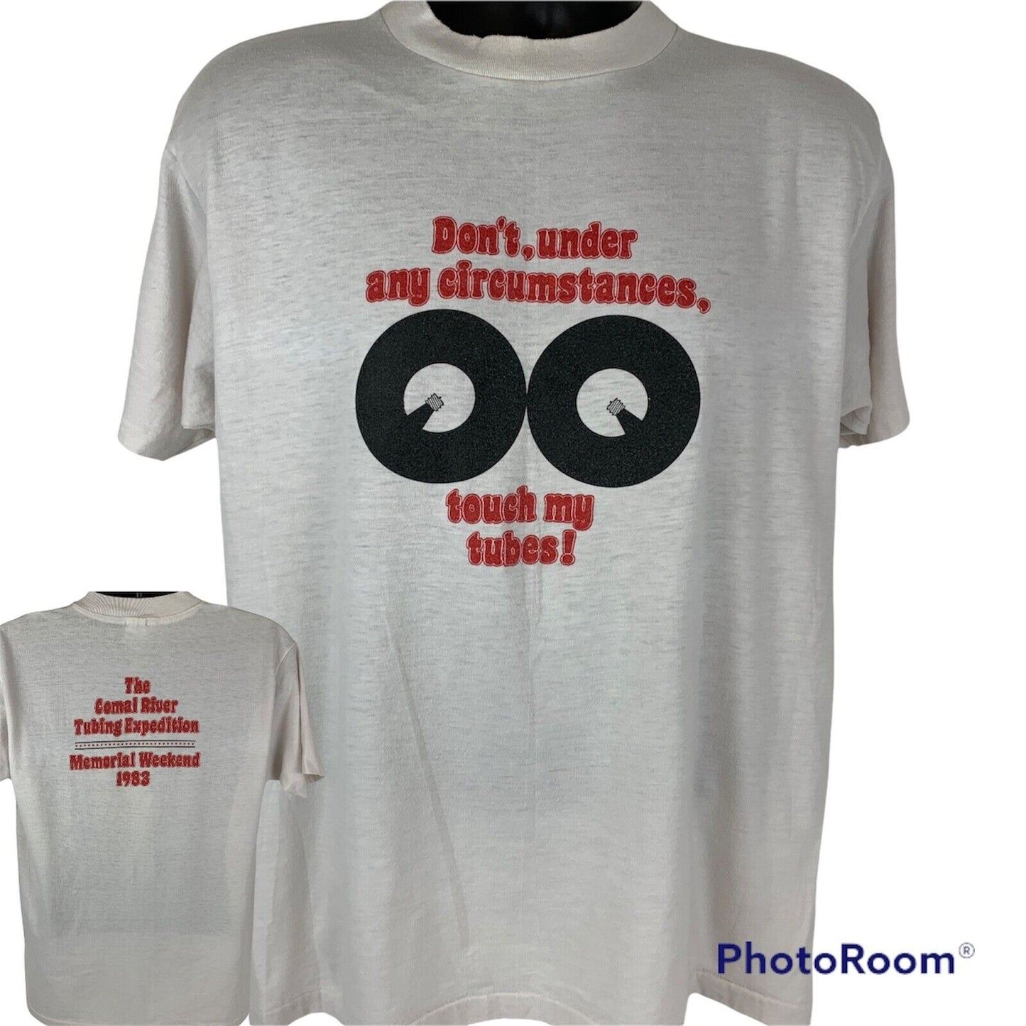 Vintage 1980s 1983 Don't, Under Any Circumstances, Touch My Tubes Comal River Tubing Expedition T Shirt New Braunfels Texas White Hanes Single Stitch Made In USA Graphic Tee