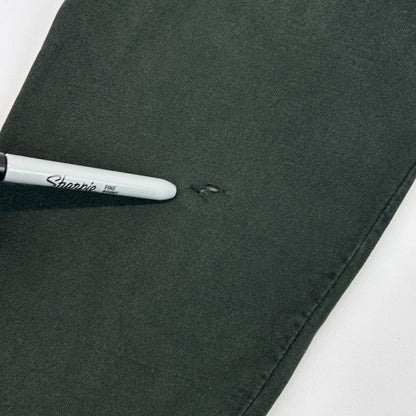 Is faded, has faint spots or uneven fading, and a hole on the back of one sleeve has been patched from the inside. The hole should not spread further and skin will not show through it. No other flaws noticed. See photos.