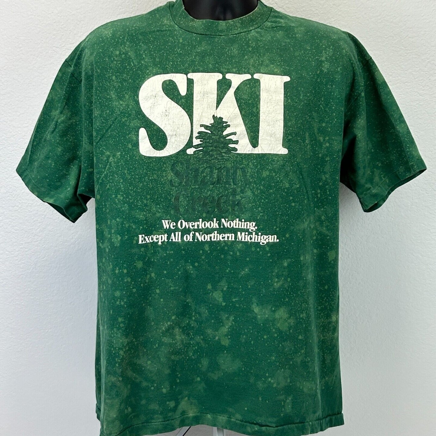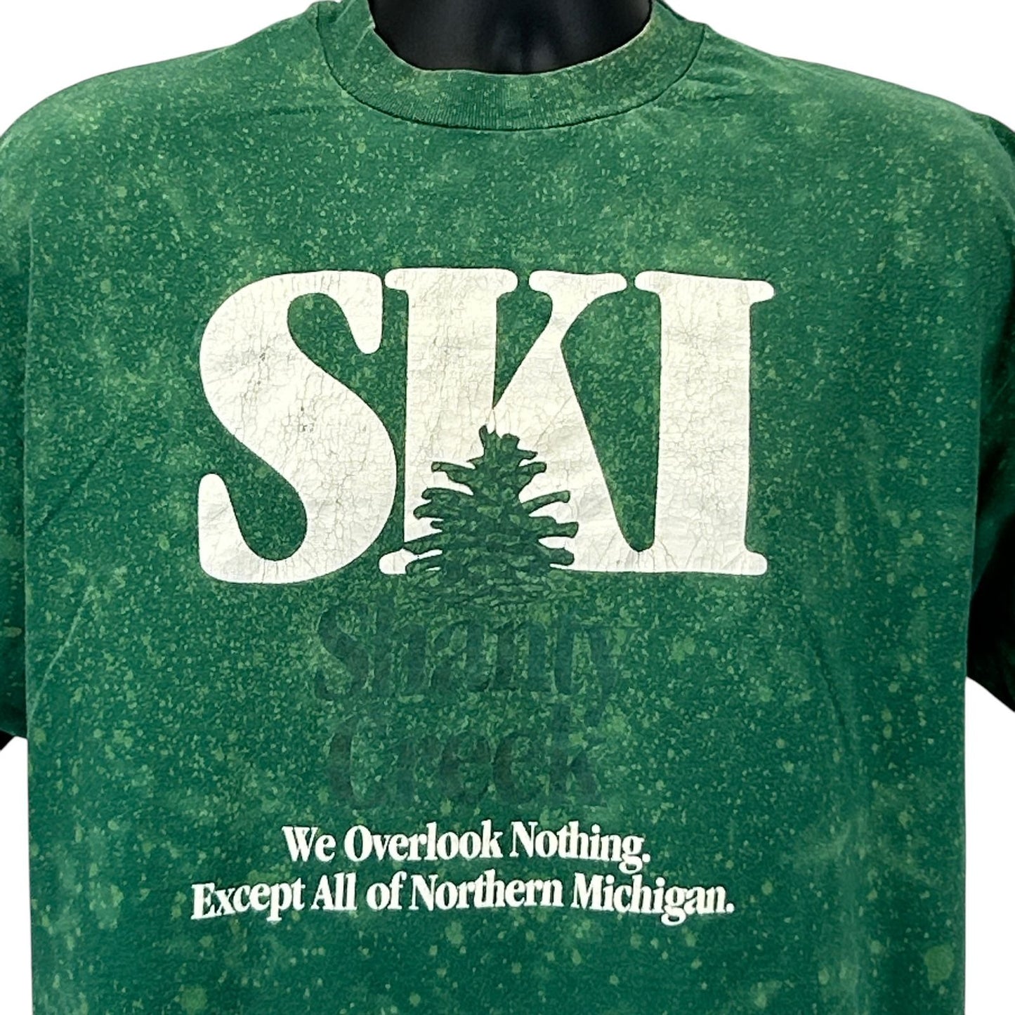Vintage Ski Shanty Creek Resort Michigan T Shirt Mens X-Large Skiing Skier Snowboarding Snowboarder 90s Green Bleach Spotted Tie Dye Hanes Single Stitch Made In USA Graphic Tee