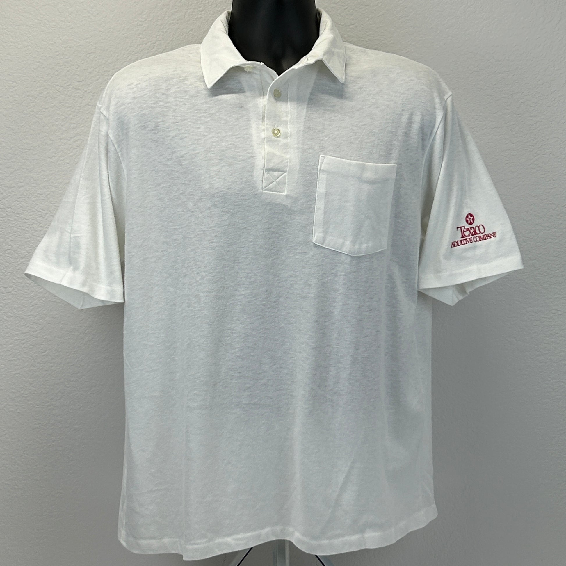 Vintage 1990s Texaco Polo T Shirt Additive Company Gas Oil Petroleum Embroidered Print-Ons Single Stitch Made In USA White Tee