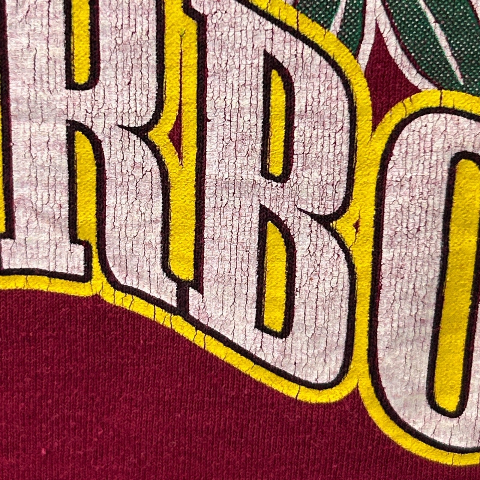 Has a fade line on one shoulder and some image cracking. No other flaws noticed. Tag is a Medium but I feel it measures more similar to a modern Small. Check measurements to ensure fit. See photos for details.