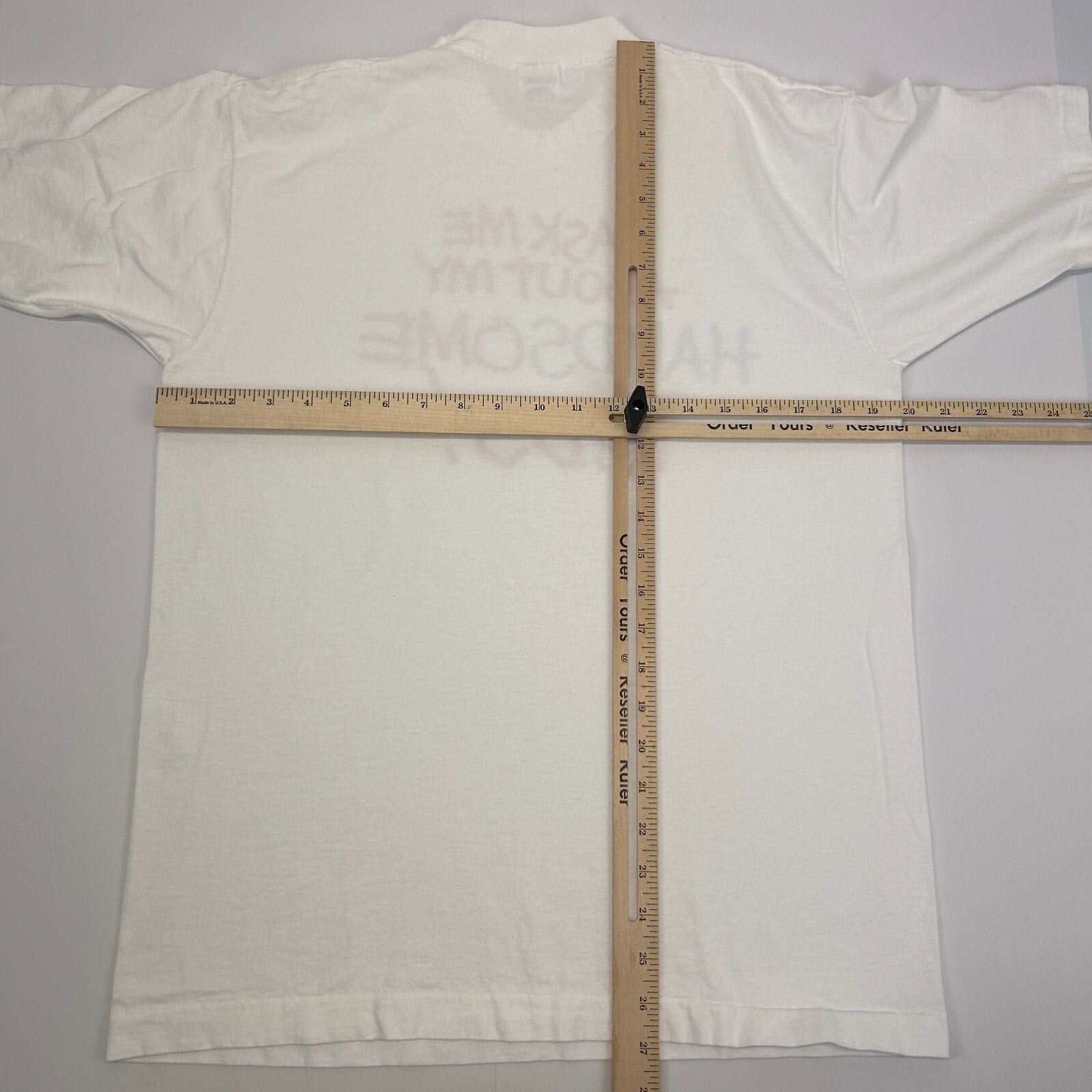 Vintage 90s Ask Me About My Handsome Kids T Shirt Mens M Medium White Parents Family Mother Father Dad Mom Children Fruit of the Loom Single Stitch Made In USA Graphic Tee