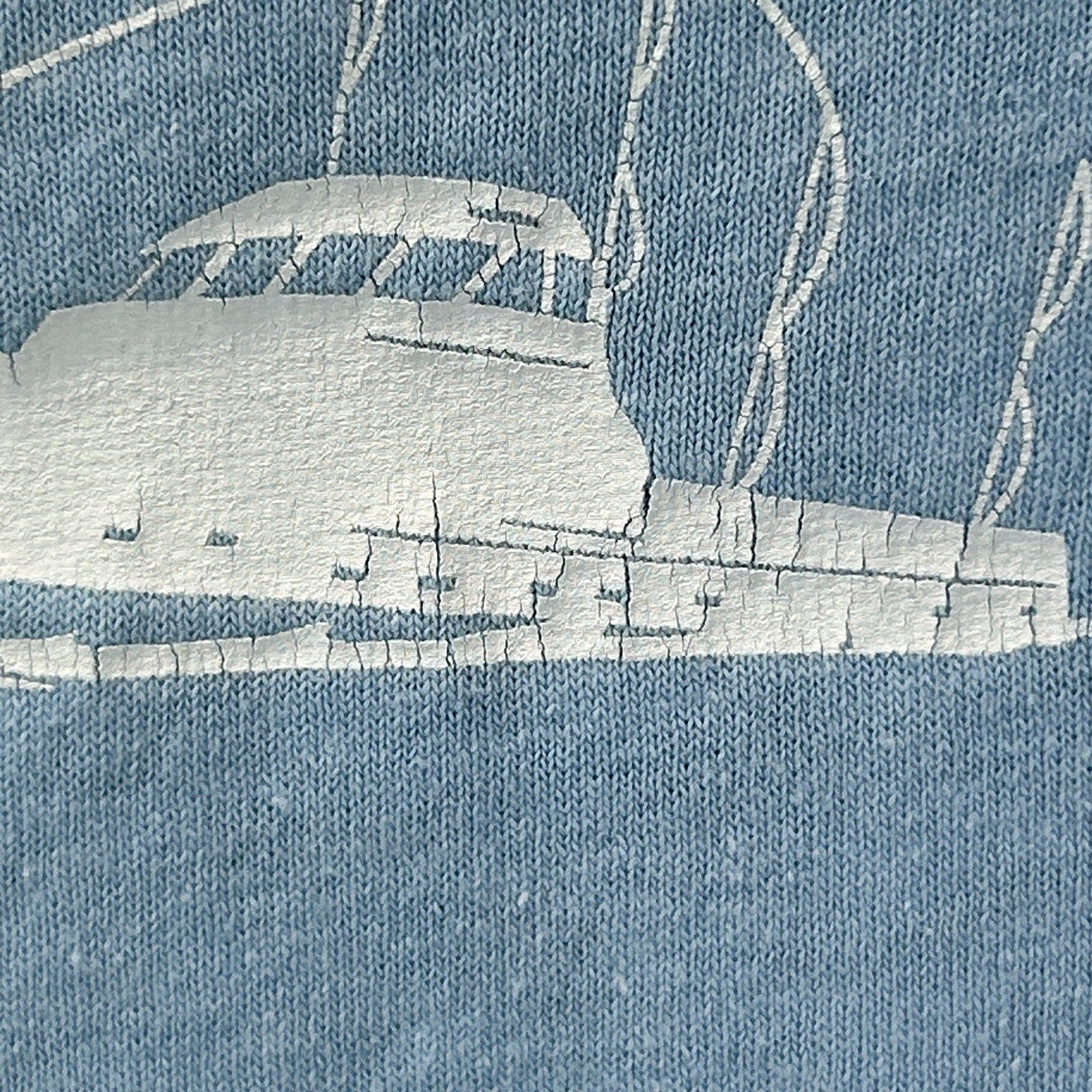 Has a couple of bleach spots on the bottom front and image cracking. No other flaws noticed. See photos.