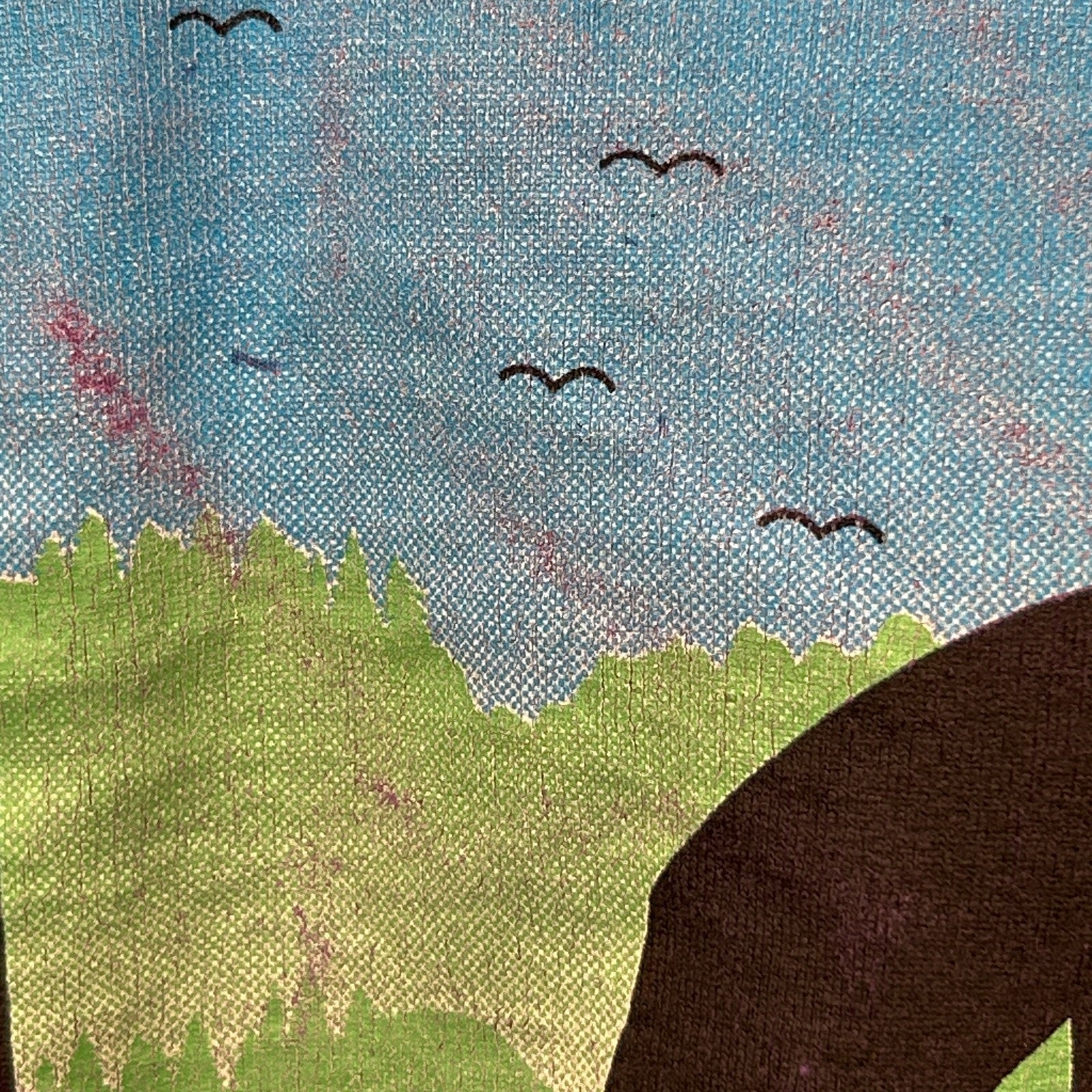 Has image cracking, a spot on the bottom back, and a bit of seam has come apart. No other flaws noticed. See photos.