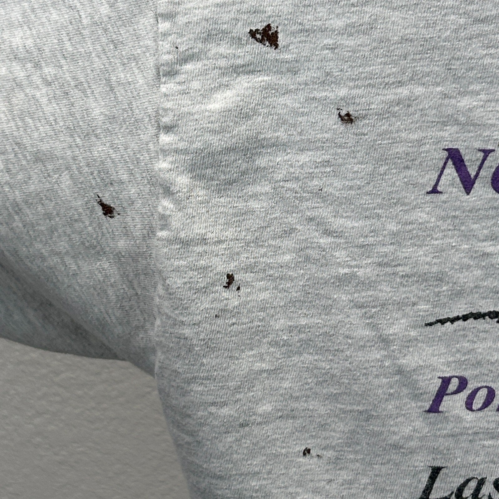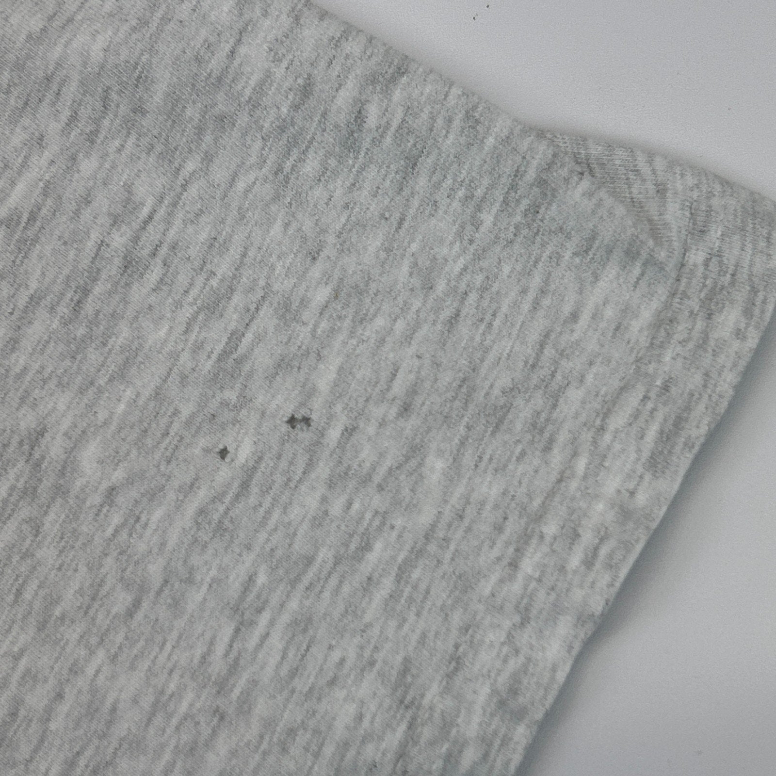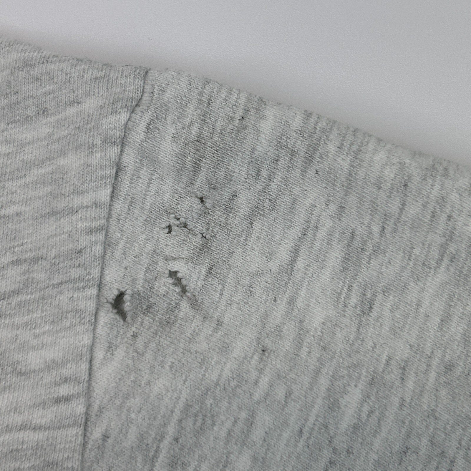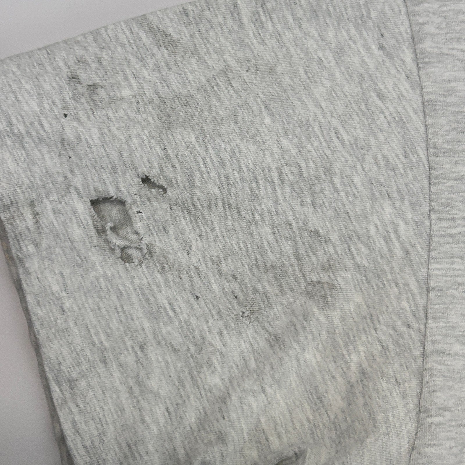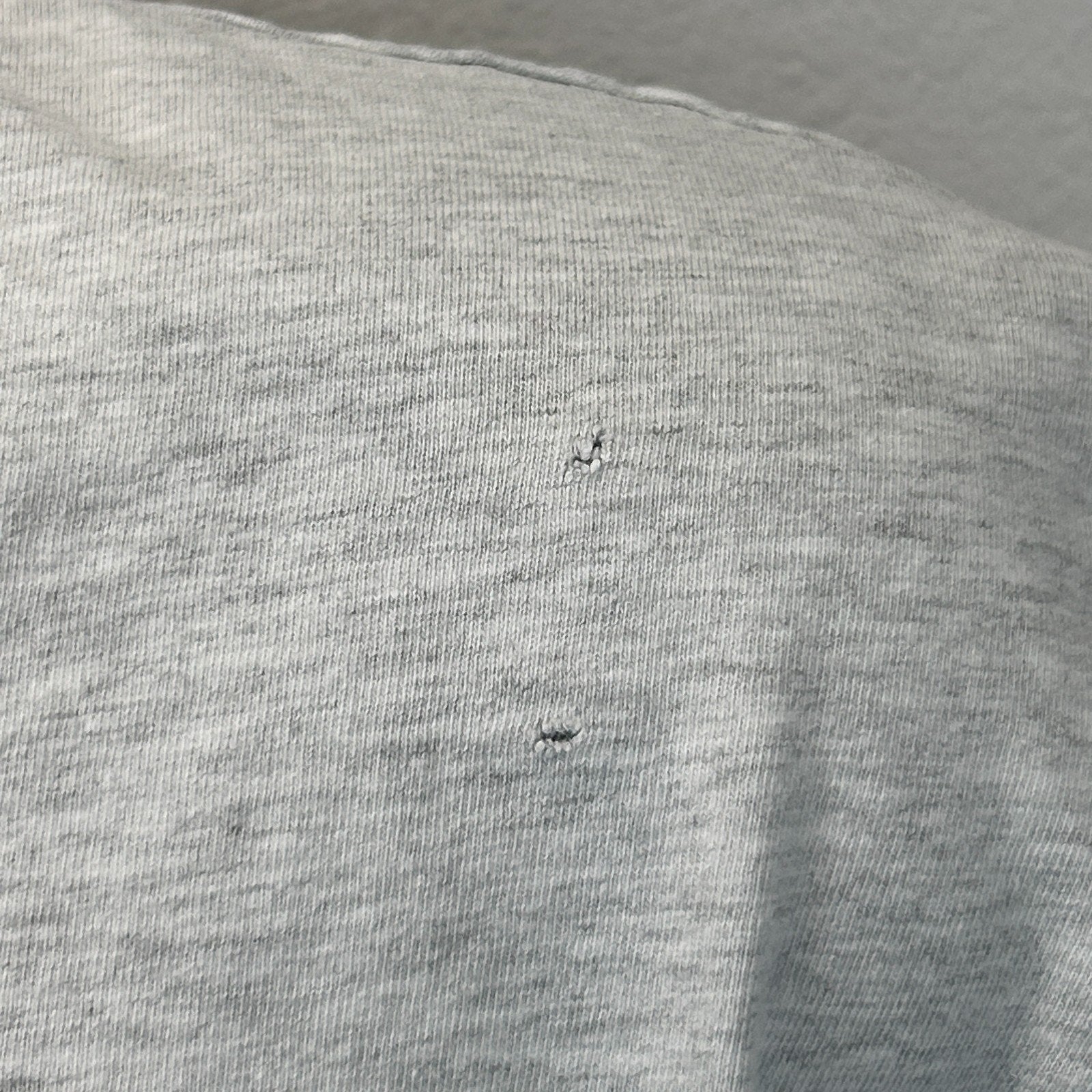 Has spots, a small pinhole on the lower back, holes on the sleeves, and a couple tiny pinholes on a front shoulder have been patched from the inside. The holes should not spread further and skin will not show through. No other flaws noticed. See photos.