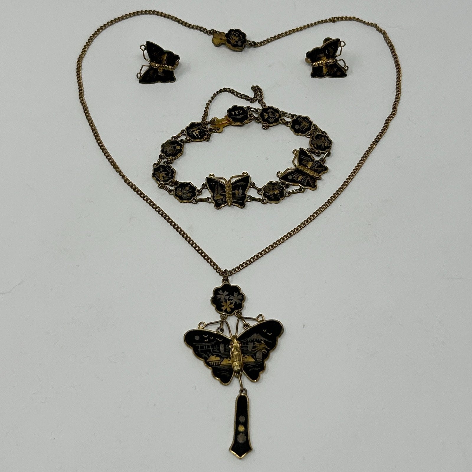Vintage K24 Japanese Damascene Butterfly Jewelry Set Necklace Bracelet Earrings