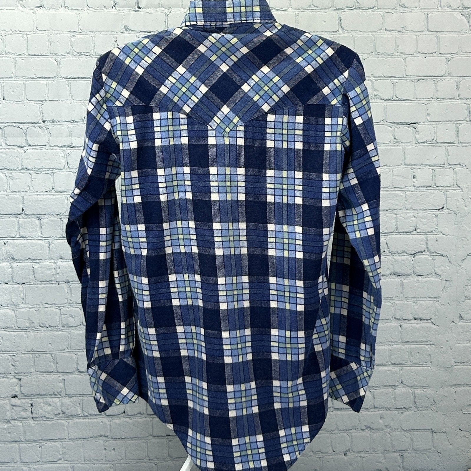 Vintage 70s Sears Western Wear Pearl Snap Flannel Button Front Shirt Grunge Cowboy Rockabilly Pockets Button Up Button Down Long Sleeve Plaid Blue M Medium