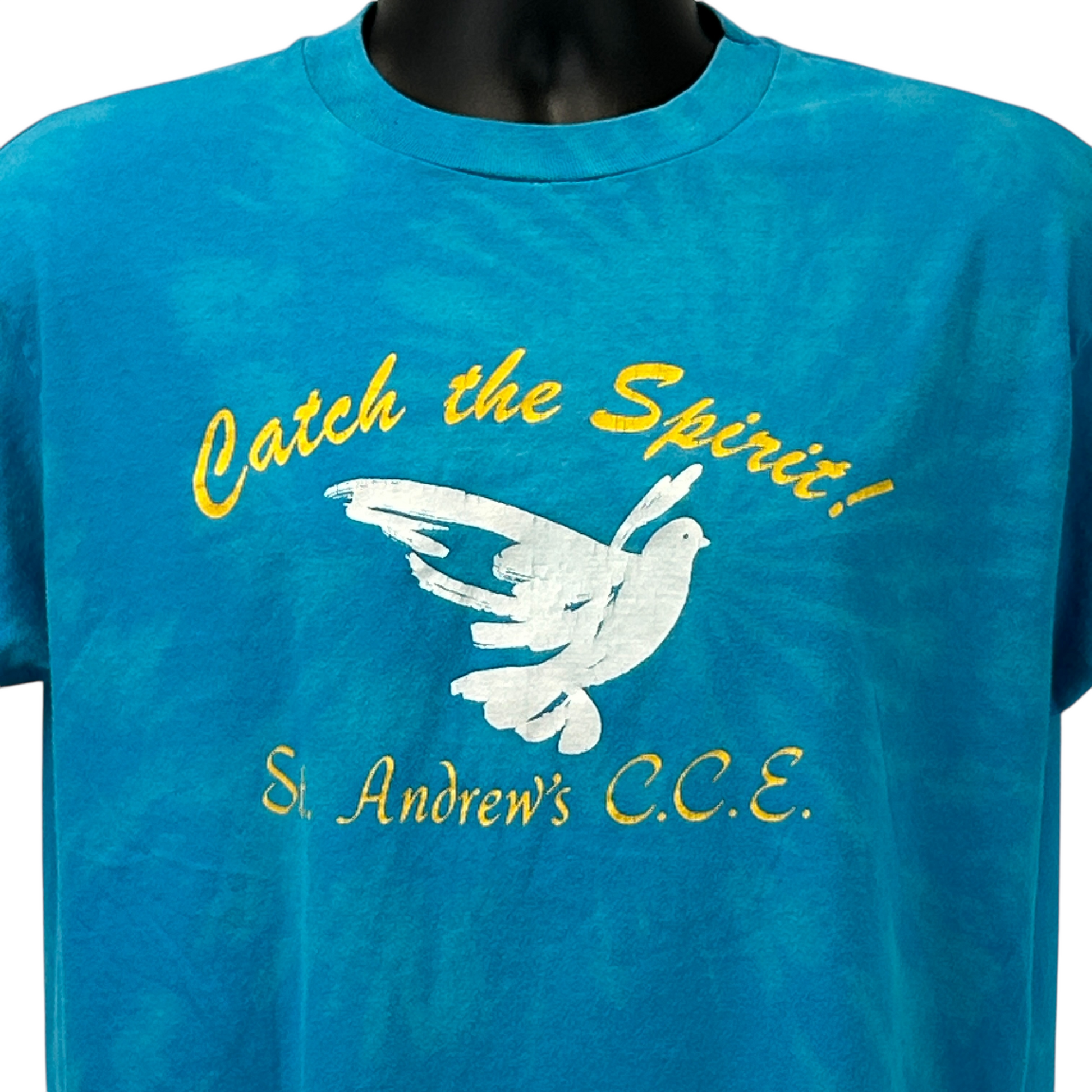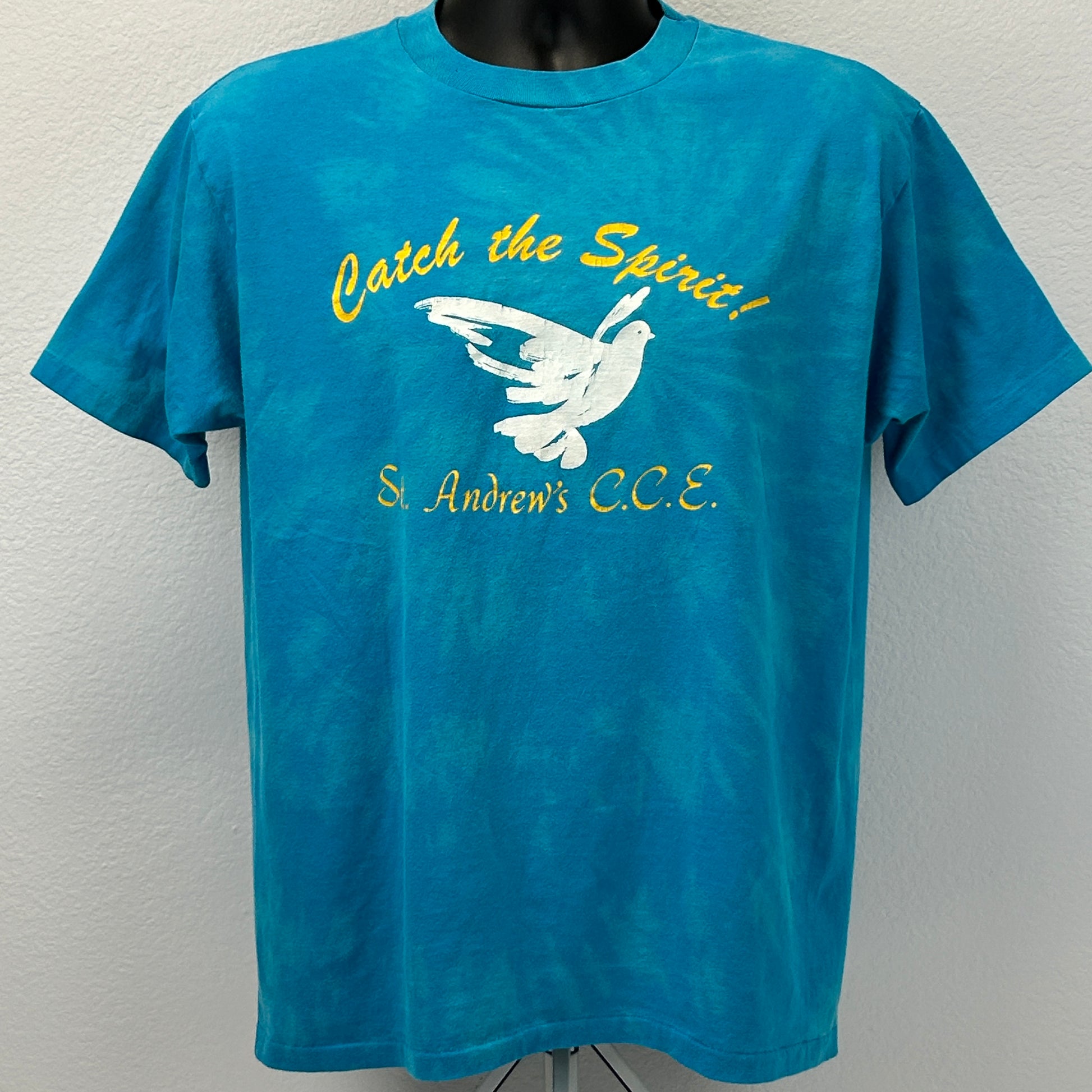复古 1980 年代圣安德鲁 CCE 教堂捕捉精神 T 恤天主教路德教会圣鸽和平宗教宗教耶稣基督继续基督教教育蓝色 Hanes 单针缝制美国制造图案 T 恤