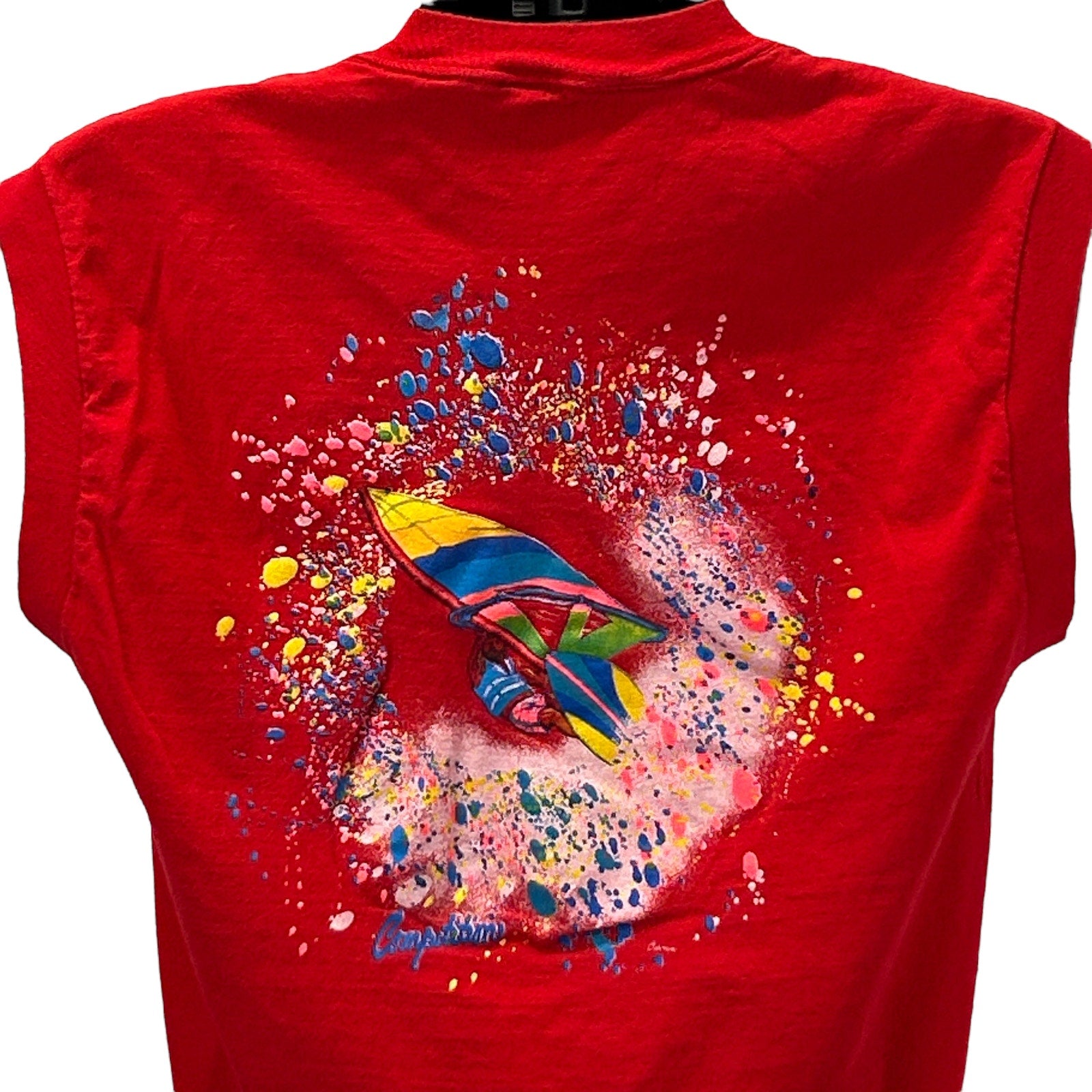 Vintage Windsurfer T Shirt Mens M Medium Red 80s Windsurfing Sailboarding Sailboarder Boardsailing Surfing Surfer Brown's Dry Goods Pond Creek Oklahoma Single Stitch Sleeveless Graphic Tee